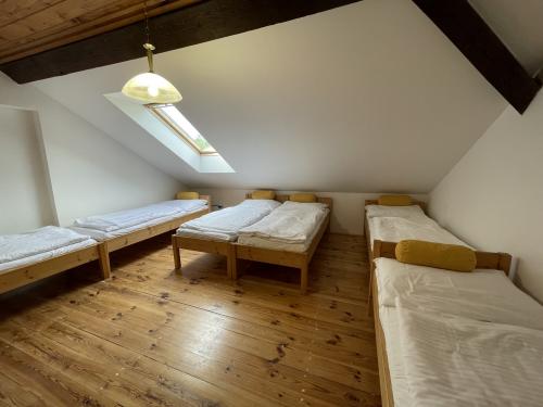 Dále nabízíme 5 pokojů situovaných v podkroví se společnými toaletami a sprchami. Tyto pokoje jsou většinou využívány uzavřenou skupinou hostů, kteří mají k dispozici celé patro penzionu.